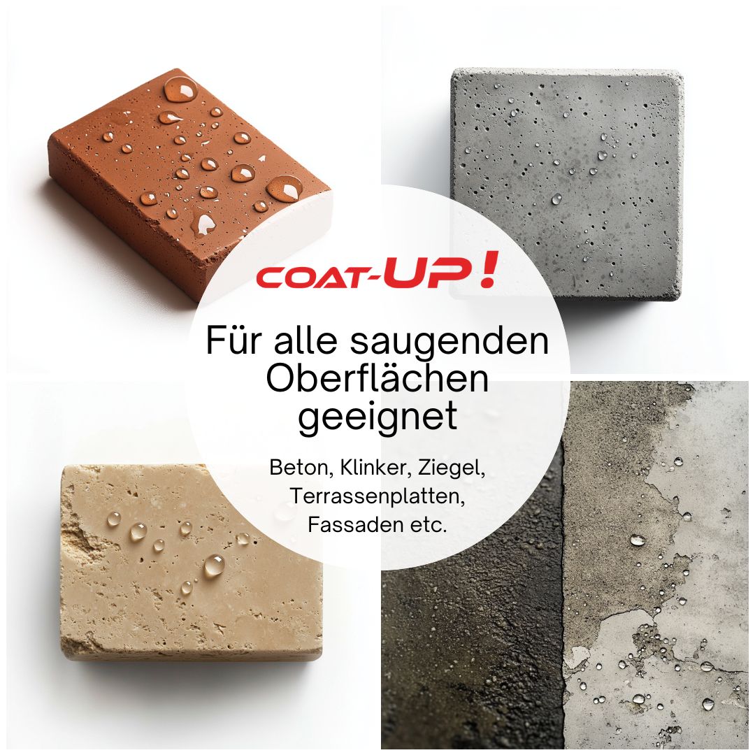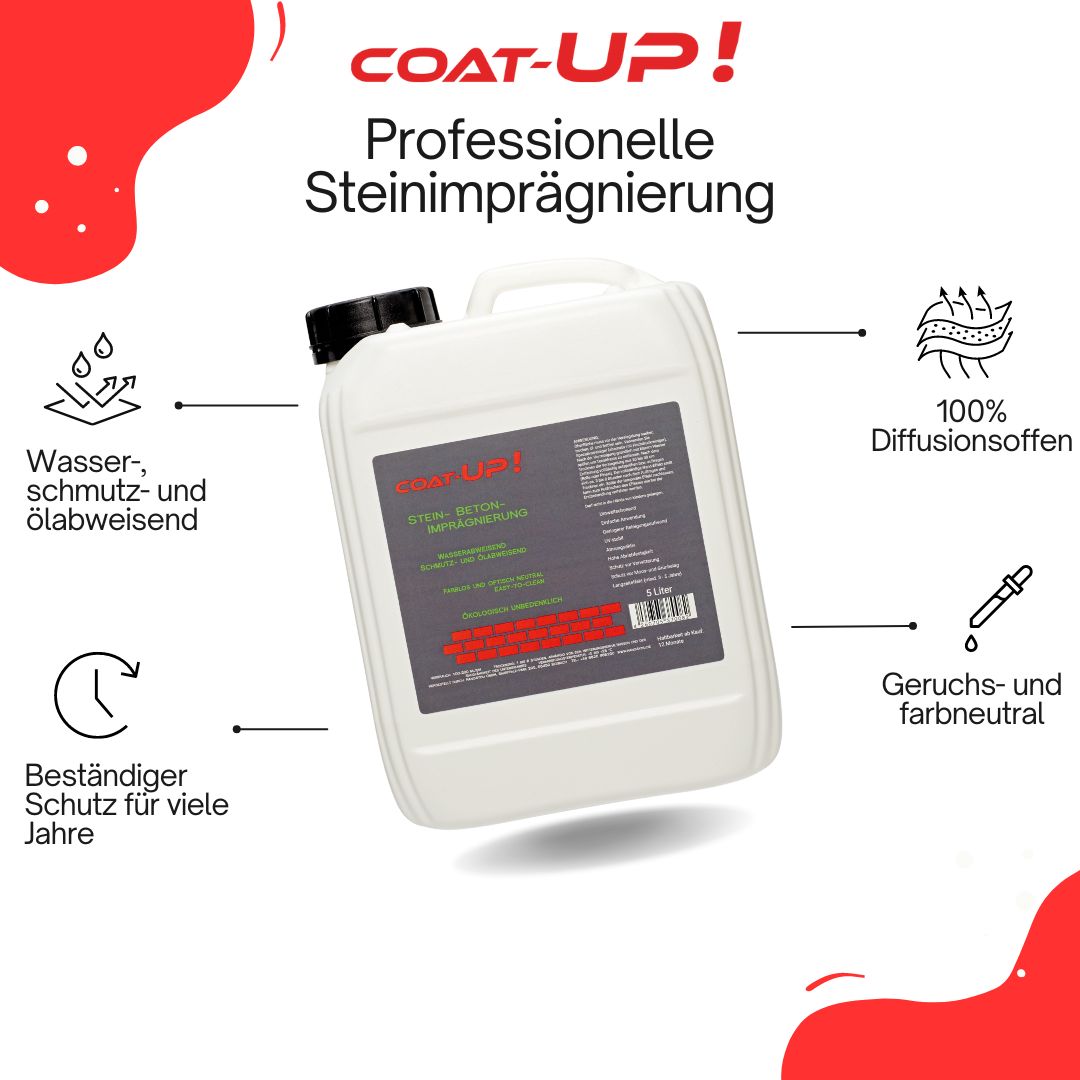 COAT-UP! Steinimprägnierung ist eine stark wasser-, öl- und schmutzabweisende, unsichtbare Schutzversiegelung, frei von organischen Lösemitteln. Selbstorganisierende Antihaft-Komponenten verleihen der Oberfläche eine unsichtbare Schicht mit hydrophoben und oleophoben Eigenschaften bei fast 100 %iger Wasserdampfoffenheit. Das Produkt kann auf sämtlichen saugenden mineralischen Oberflächen aufgetragen werden, wie z.B. Beton, Klinker, Ziegel, Sand- und Naturstein, Granit, Pflastersteine, Terrassenplatten etc.